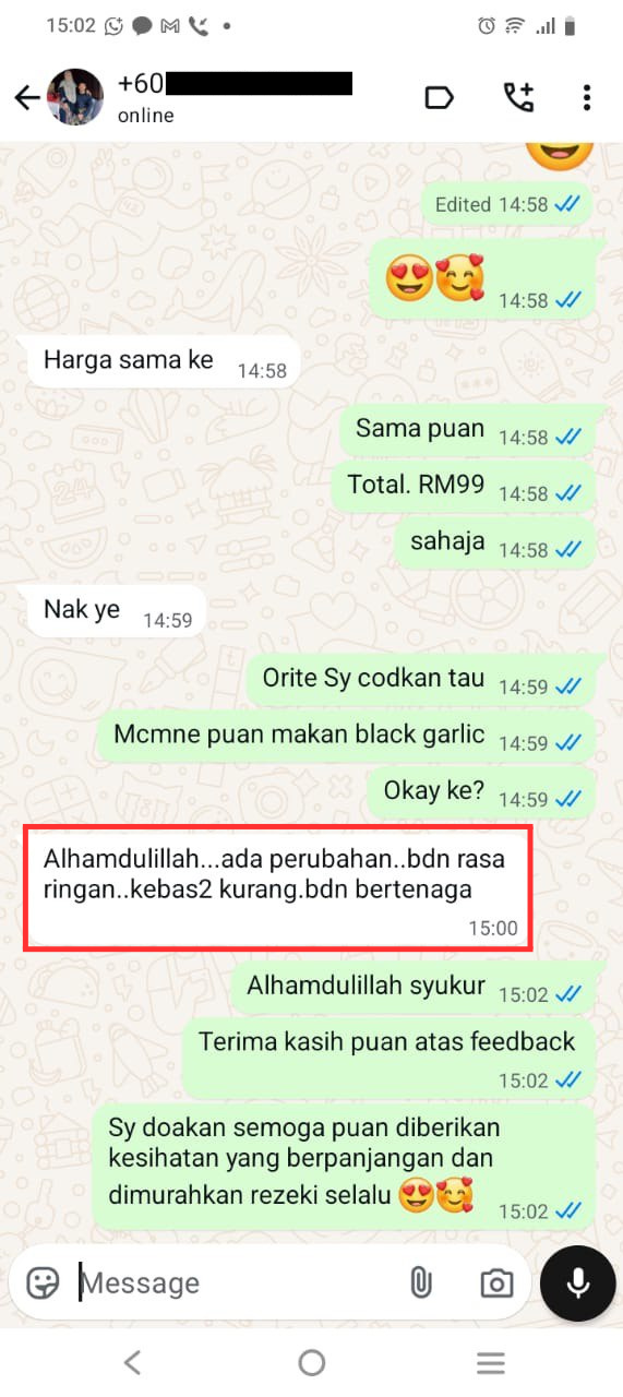 Maklum balas yang luar biasa! Rata-rata pengguna Black Garlic Purelife memberikan maklum balas yang sangat positif. Alhamdulillah, setakat ini kami belum menerima sebarang maklum balas yang tidak berkesan. Pengguna merasai sendiri manfaatnya dalam menjaga kesihatan.